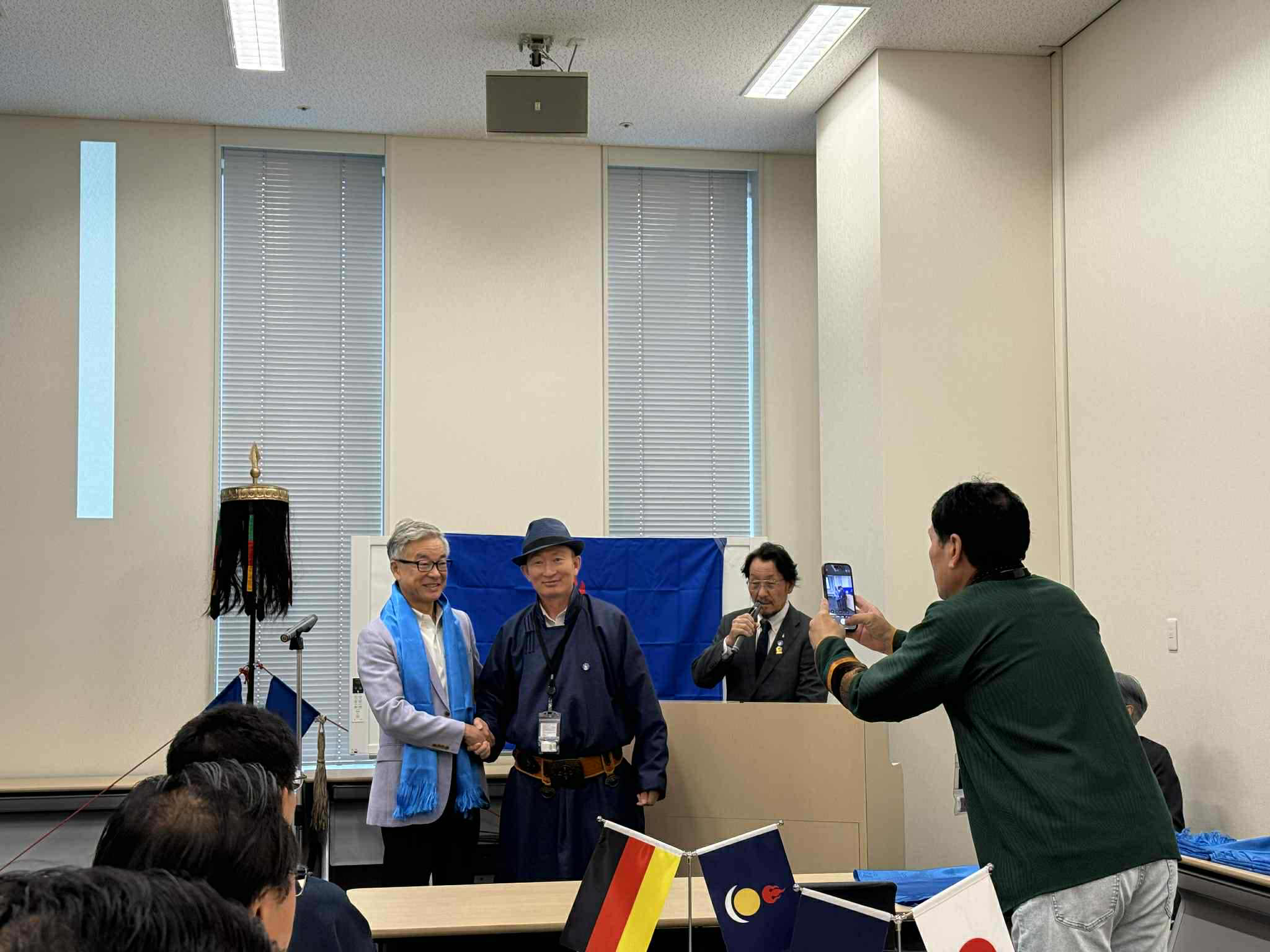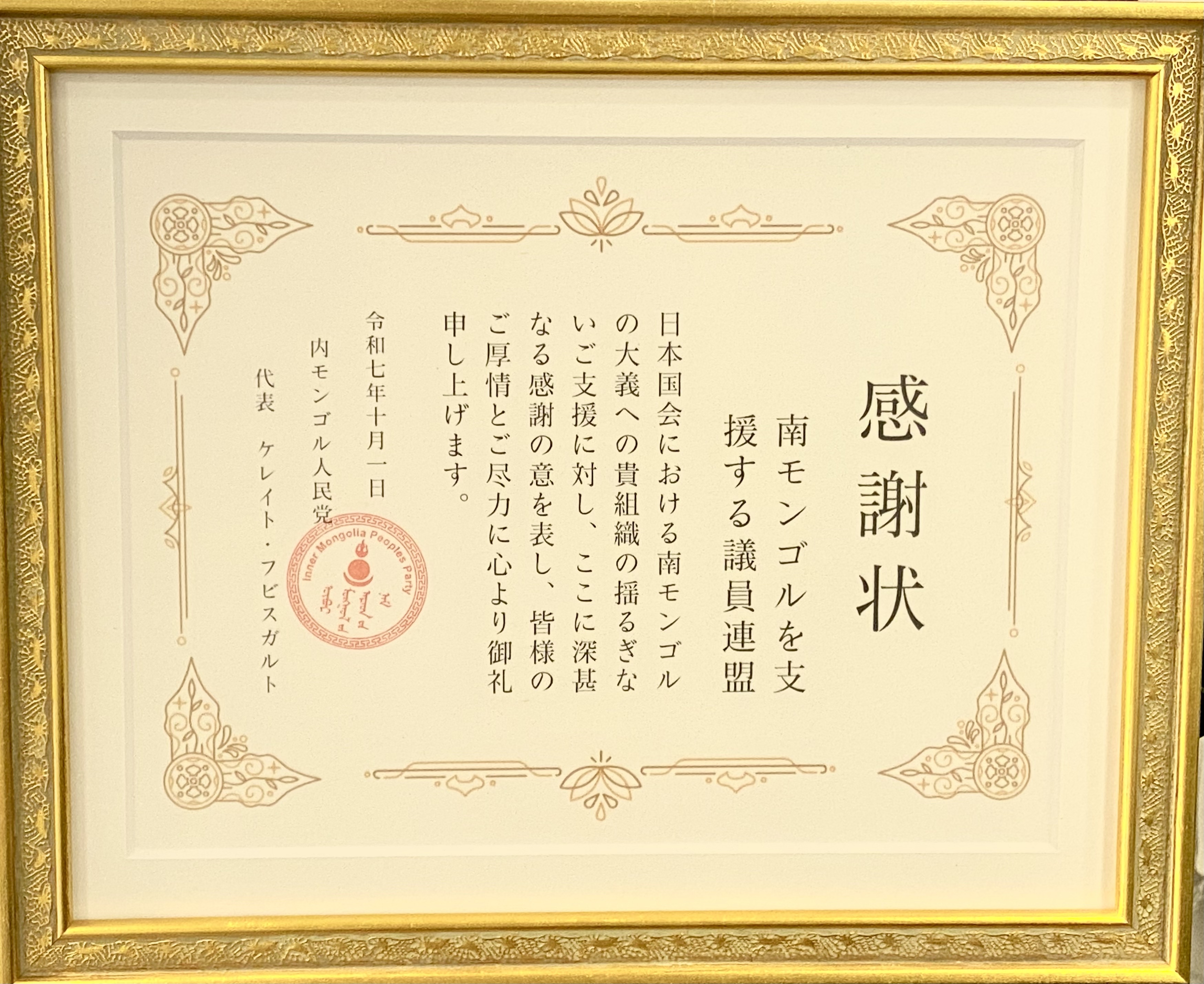 Certificates of appreciation were presented to the Japanese Parliamentary League for Supporting Southern Mongoliafor their unwavering support of the Southern Mongolian cause within the Japanese Parliament, and to Mr. Hidetoshi Ishiiand Mrs. Yoko Ishii for their great efforts in promoting the cause of Southern Mongolia, including their instrumental role in making the nomination of two Mongolians for the 2025 Nobel Peace Prize possible.