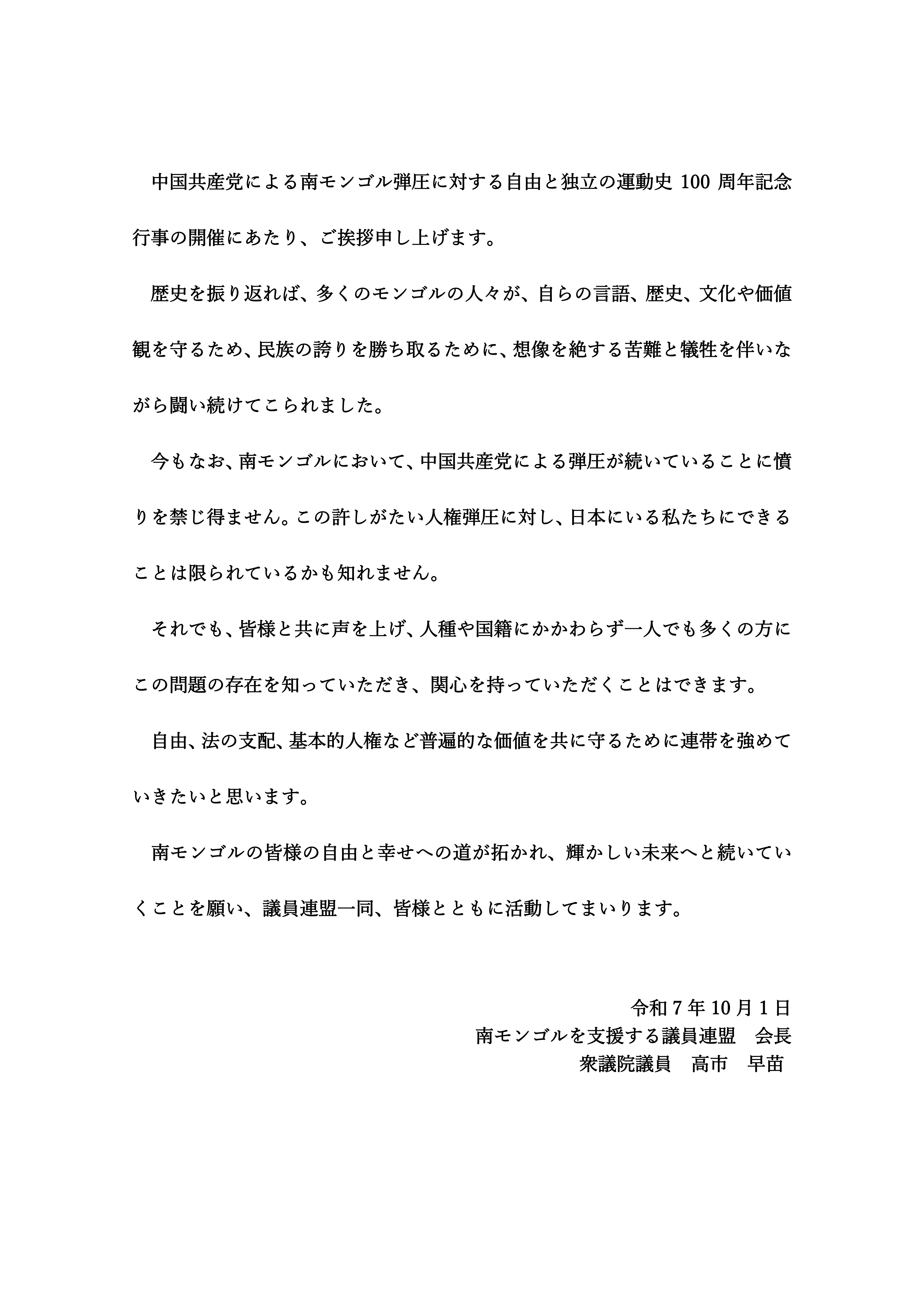 A congratulatory message was delivered on behalf of the Parliamentary League for Supporting Southern Mongolia, chaired by Hon. Sanae Takaichi, Member of the House of Representatives.In her message, Hon. Takaichi stated, “Wishing that the path to freedom and happiness for all the people of Southern Mongolia will open and lead to a bright future, the members of our parliamentary league will continue to work together with you.”