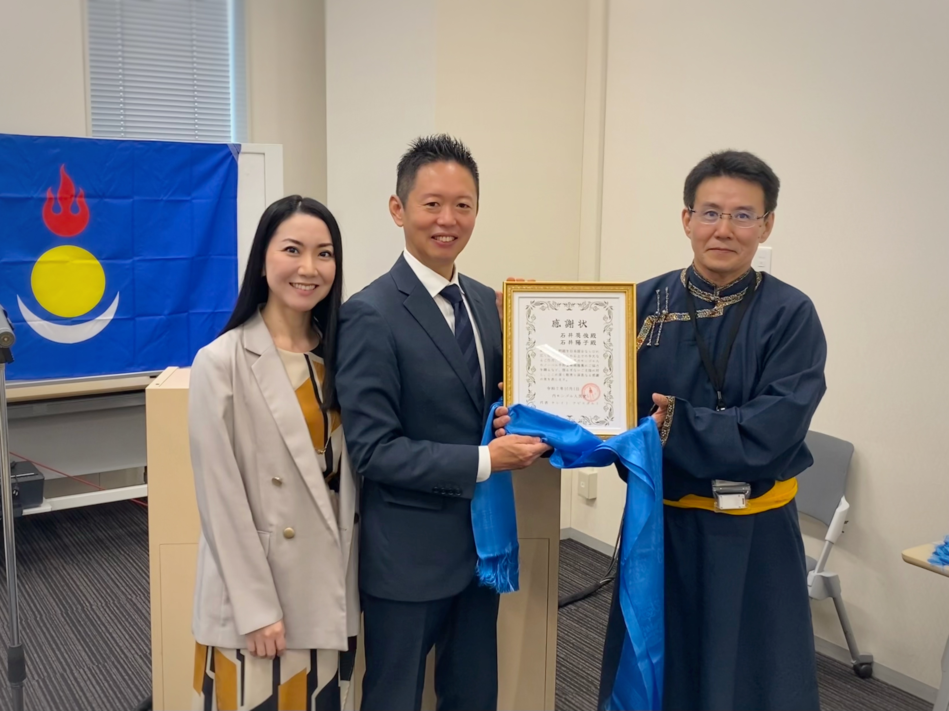 Certificates of appreciation were presented to the Japanese Parliamentary League for Supporting Southern Mongoliafor their unwavering support of the Southern Mongolian cause within the Japanese Parliament, and to Mr. Hidetoshi Ishiiand Mrs. Yoko Ishii for their great efforts in promoting the cause of Southern Mongolia, including their instrumental role in making the nomination of two Mongolians for the 2025 Nobel Peace Prize possible.